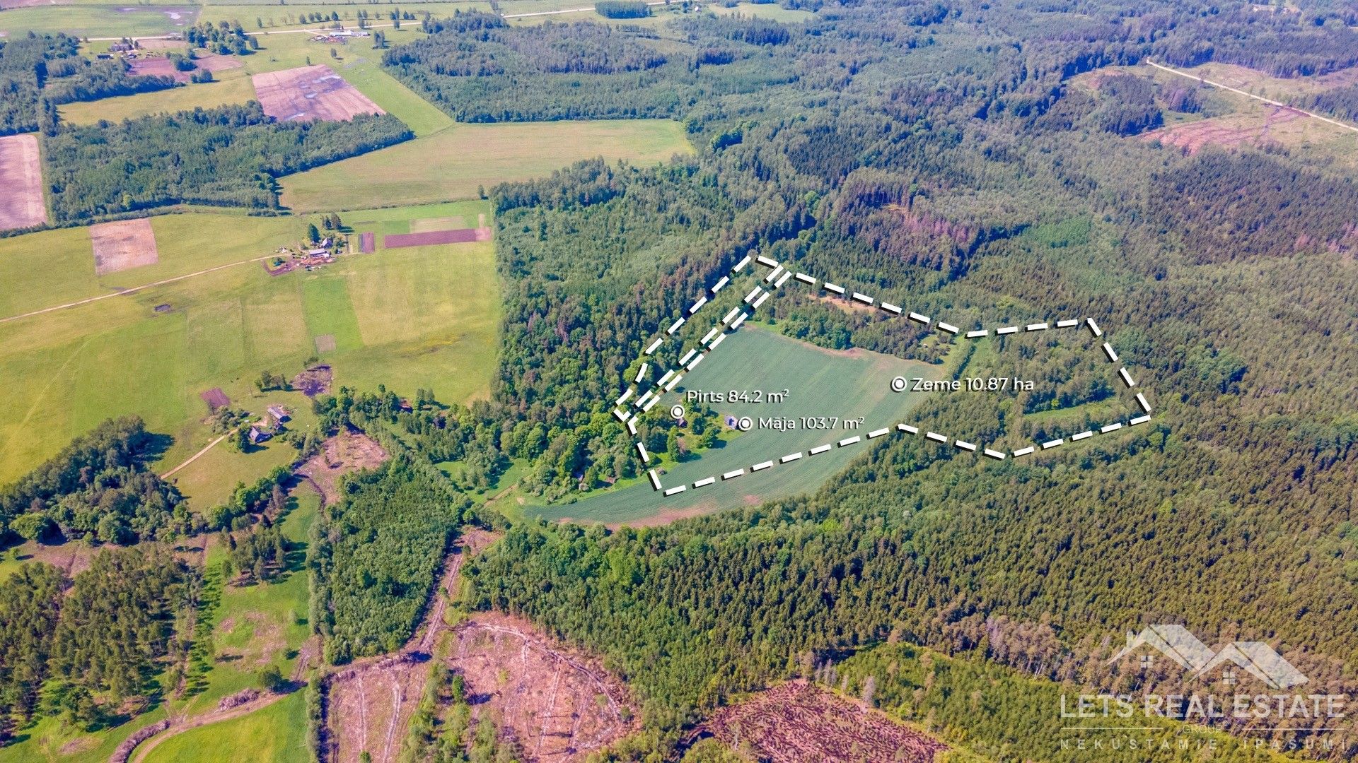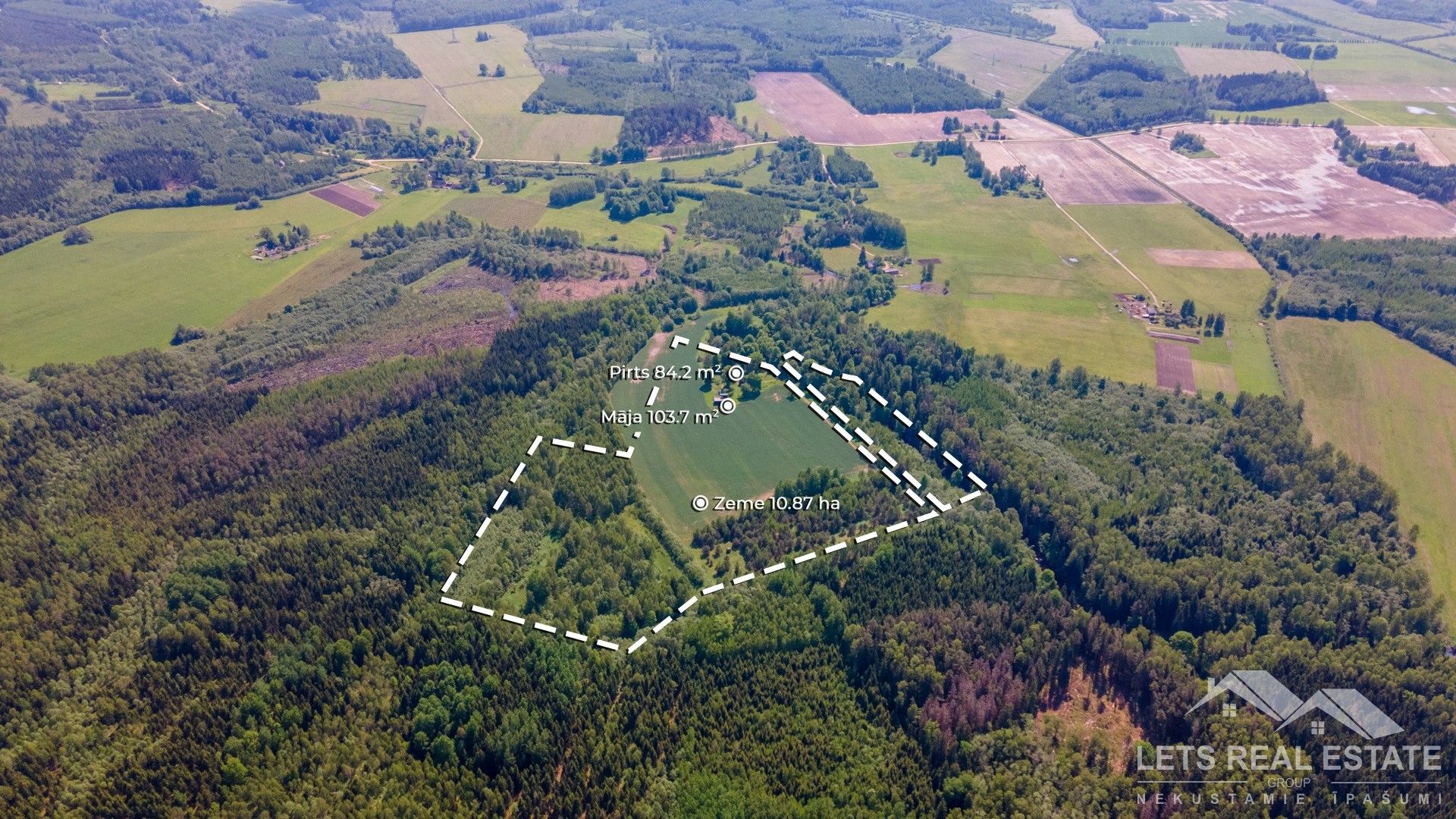 Pārdošanā lauku īpašumu kas sastāv no 103.7 m² dzīvojamās mājas, 84.2 m² guļbūve-pirts, zeme 10.87 ha. Īpašums atrodas unikālā, svešiniekiem nepieejamā vietā un ļauj palikt pilnīgā vientulībā ar dabu, nezaudējot ierasto pilsētas dzīves komfortu. Būves nodotas ekspluatācijā 2021 gadā. Dzīvojamā māja ir celta pēc pasīvās mājas principa, tajā ir dzīvojamā istaba, virtuves zona ar visu nepieciešamo sadzīves tehniku. San mezgls apvienots- duša. Apkure siltuma sūknis, kamīns, Bio kanalizācija. Internets. Pilnībā mēbelēts. Izbūvētas āra trepes uz mājas jumta stāvu kur paveras lielisks skats uz lauku un ir izbūvēta atsevišķa guļamistaba viesiem. Guļbūvē - pirtī ir dzīvojamā istaba, virtuve, san mezgls, pirts, otrajā stāvā liela guļamistaba. Apkure malkas, kondicionieris – gaisa siltum sūknis, Bio kanalizācija. Elektrības pieslēgums 3 fāzes, ūdens – aka ar ūdens sūkni. Teritorijā atrodas arī šķūnis, ēka saimniecības lietām. Īpašums atrodas 100 km no Rīgas, meža ielokā klusā, skaistā, vietā pie Zalvītes upes. Laba vieta, lai medītu, makšķerētu. Līdz autobusa pieturai 3 km, līdz Aizkrauklei 37 km, Neretai 30 km. Īpašums bez nodokļu parādiem, zemesgrāmata, vairāk informācijas telefoniski vai klātienē. Cena runājama.